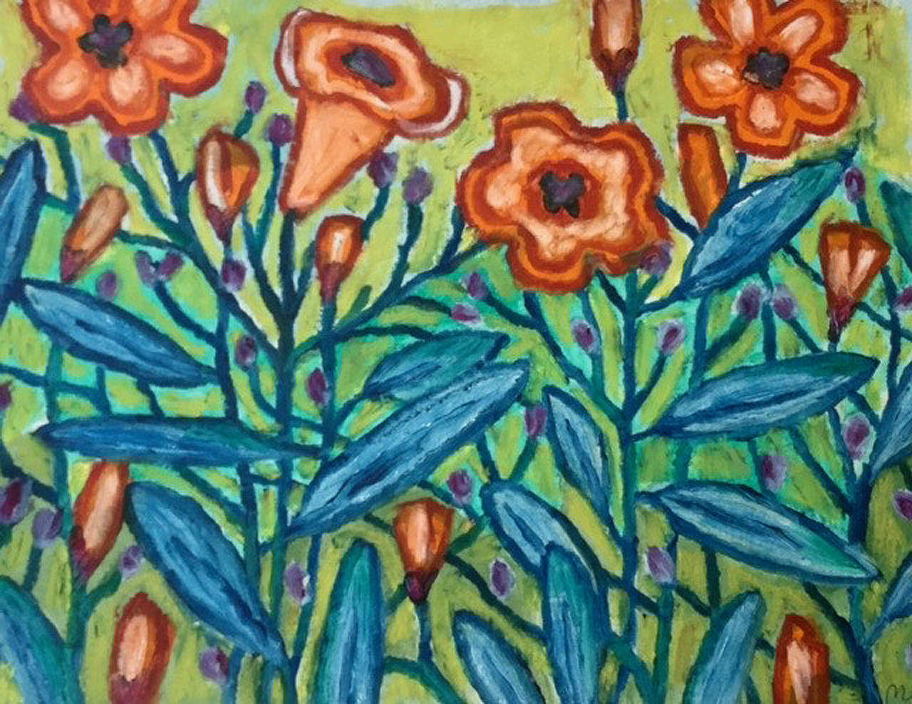 orange-flowers February 27, 2017 • 1280 × 988 • Figurative drawings and paintings [SOLD] Orange Flowers – oilbar on paper – 25x33cm