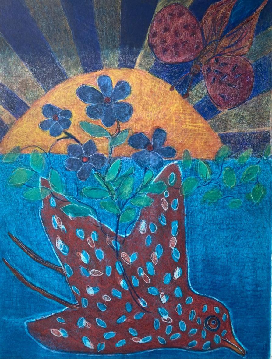 Swooping Bird April 3, 2025 • 1211 × 1600 • A selection of current work Swooping Bird – monoprint, hand colouring – 50 x 30 cm