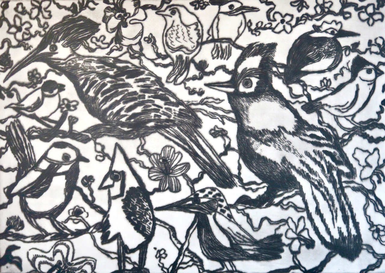 Ten Birds_drypoint_mono print_30x42cm_bw April 8, 2019 • 1280 × 906 • A selection of current work Ten Birds – drypoint, monoprint – 30 x 42 cm